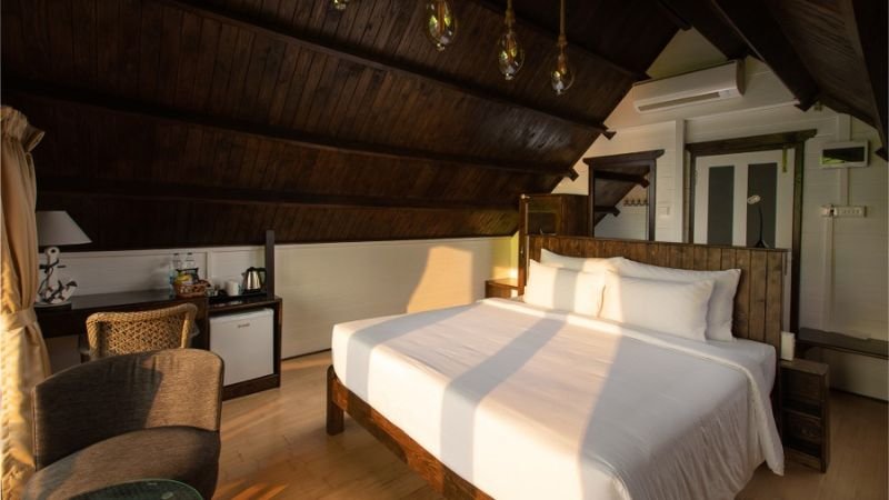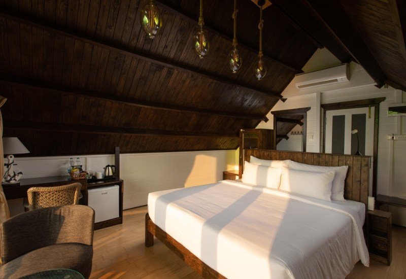Ark Peace offers a cosy and stylish retreat designed for both comfort and privacy. The main area features a king-size bed with side tables, a small pantry for convenience, and a comfortable seating setup with chairs and a centre table. Perfect for reading, relaxing, or enjoying a quiet cup of coffee.