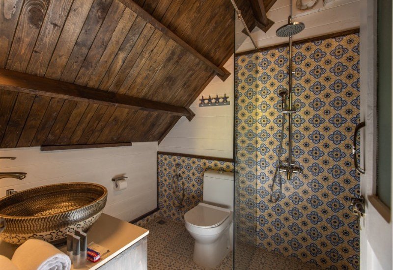 A well-planned attached bathroom includes a shower area, WC, and washbasin, ensuring functionality within a compact layout. With its warm, inviting ambience and practical design, this attic floor serves as an ideal private suite or guest space, combining charm with modern comfort.