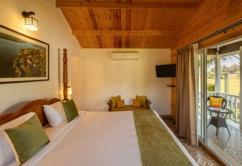 The plan features a spacious bedroom with a comfortable double bed, side tables, and a cozy seating area that invites relaxation and quiet reflection. The attached bathroom is designed with functionality and style, offering convenience and a touch of sophistication.